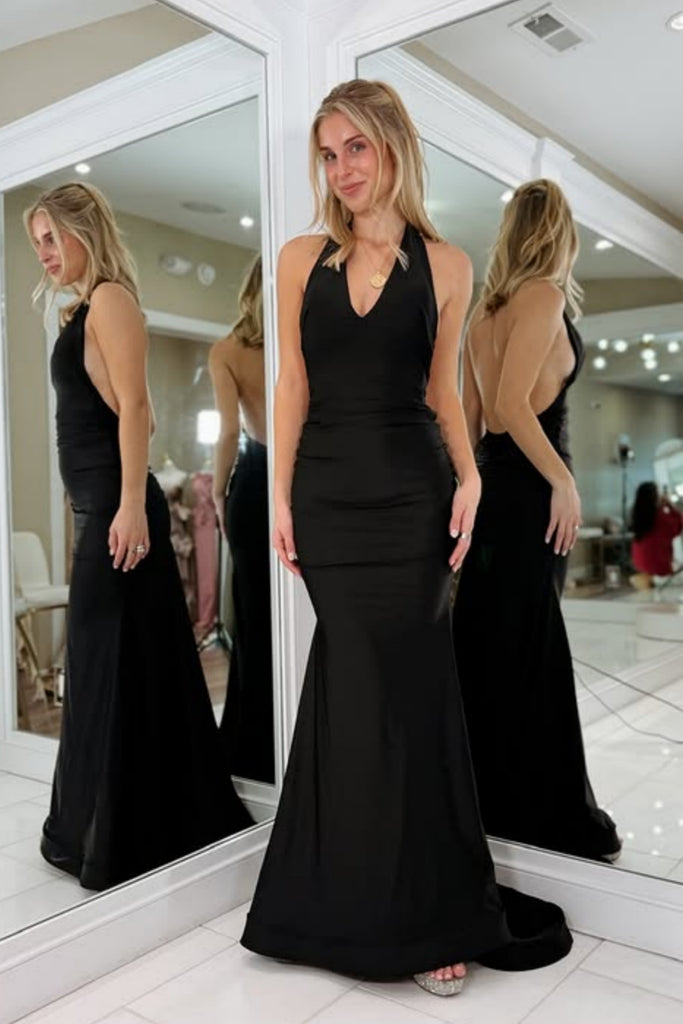 Black Satin Halter Neck Mermaid Long Prom Dresses, Backless Black Formal Dresses, Mermaid Black Evening Dresses WT1794