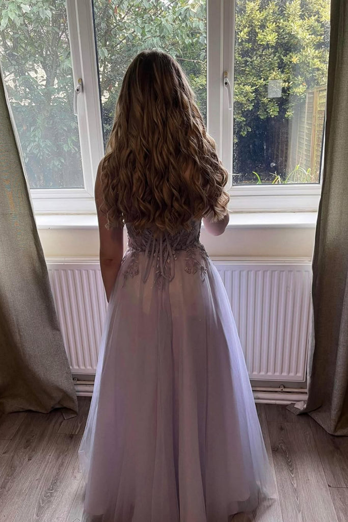 Lavender Tulle A Line V Neck Lace Long Prom Dresses, Lavender Lace Formal Graduation Evening Dresses WT1717