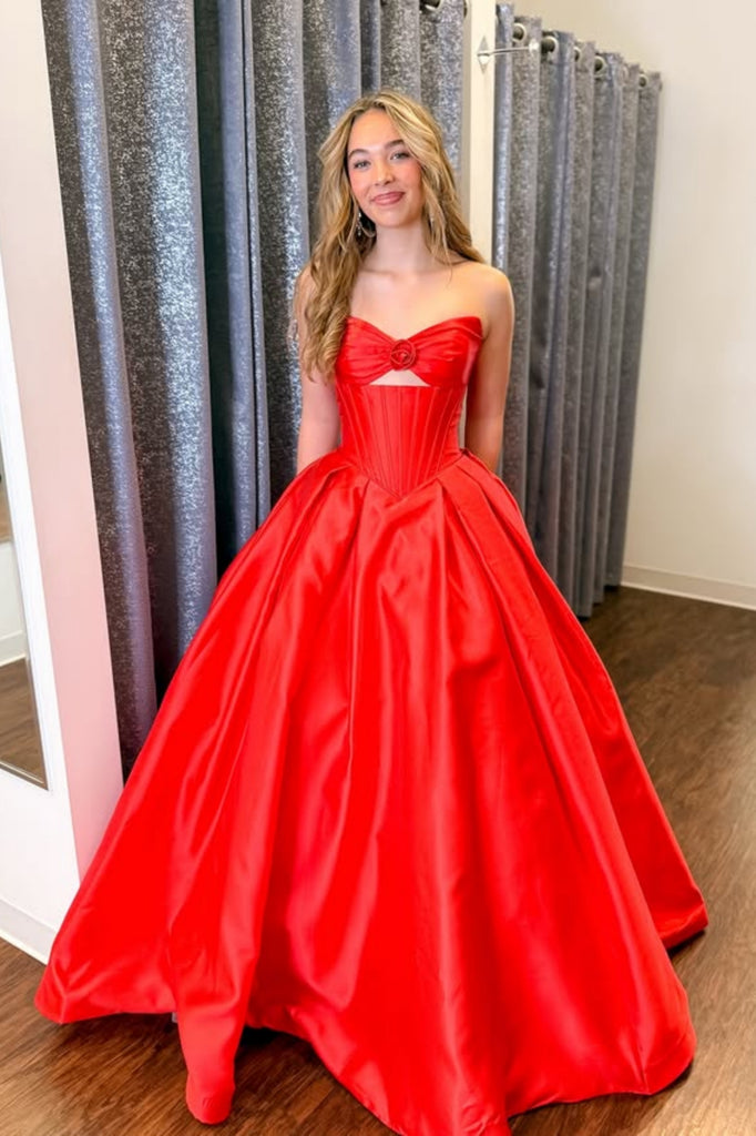 Red Satin Strapless A Line Long Prom Dresses, Red Formal Graduation Evening Dresses WT1799