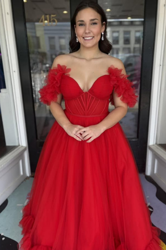 Red Tulle Off the Shoulder Long Prom Dresses, Off Shoulder Formal Dresses, Red Tulle Evening Dresses WT1748