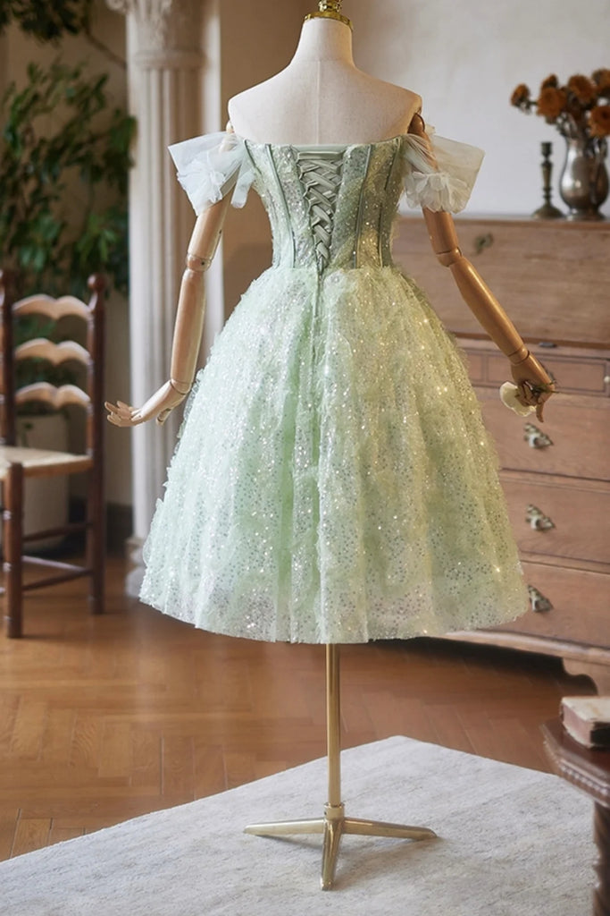 Shiny Sequins Off the Shoulder Green Short Prom Dresses with 3D Flowers, Off Shoulder Green Homecoming Dresses, Green Floral Formal Graduation Evening Dresses WT1655