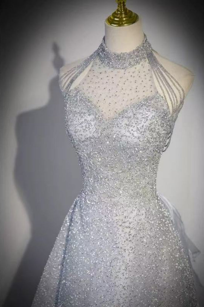 Shiny Silver Gray Sequins A Line Halter Neck Long Prom Dresses, Silver Gray Formal Graduation Evening Dresses WT1721