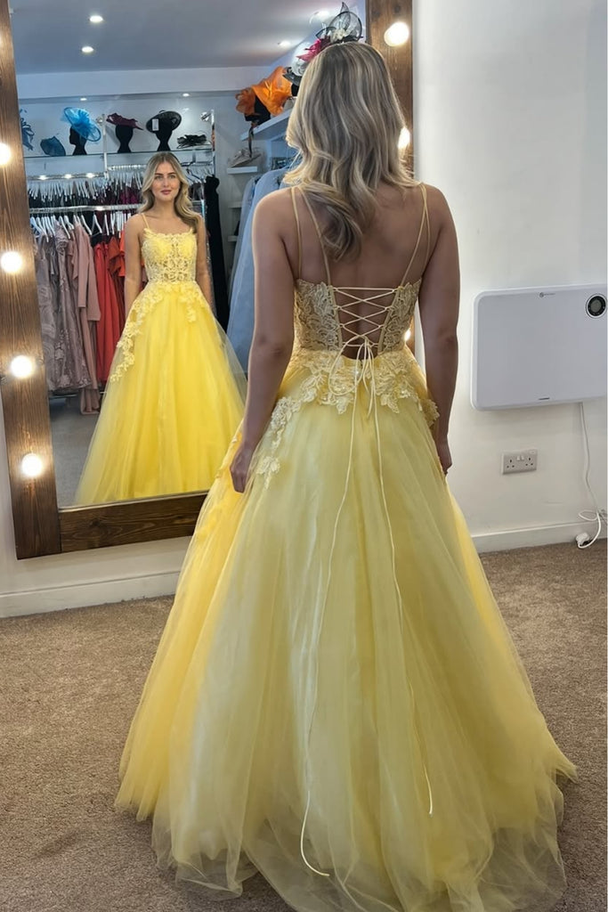 Yellow Tulle A Line Square Neck Backless Lace Long Prom Dresses, Yellow Lace Formal Graduation Evening Dresses WT1741